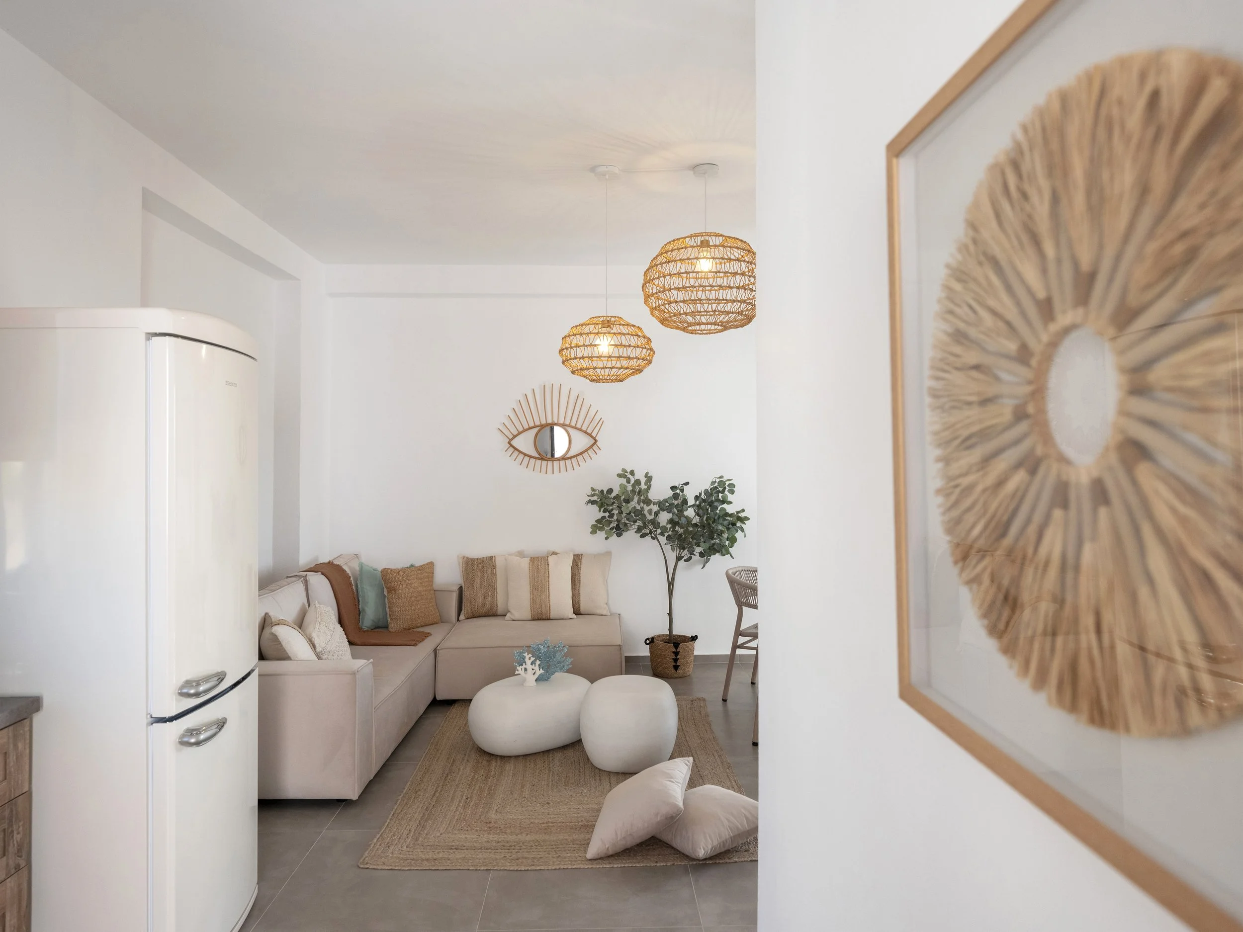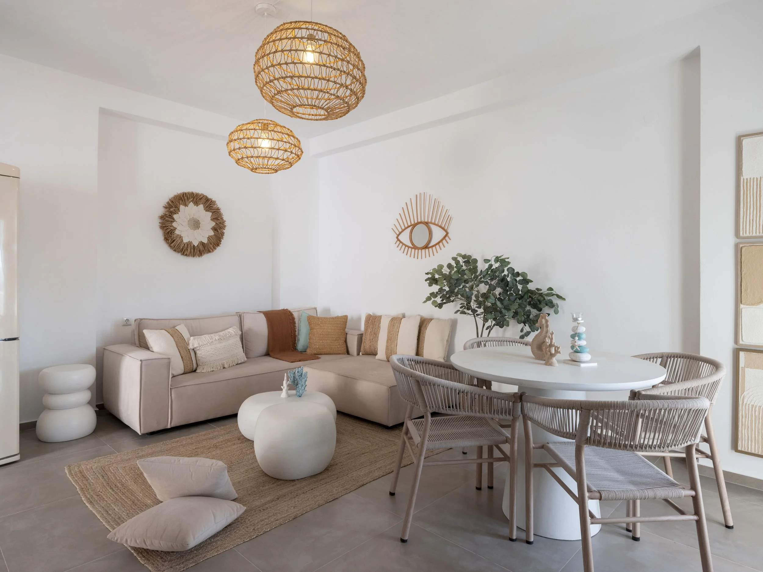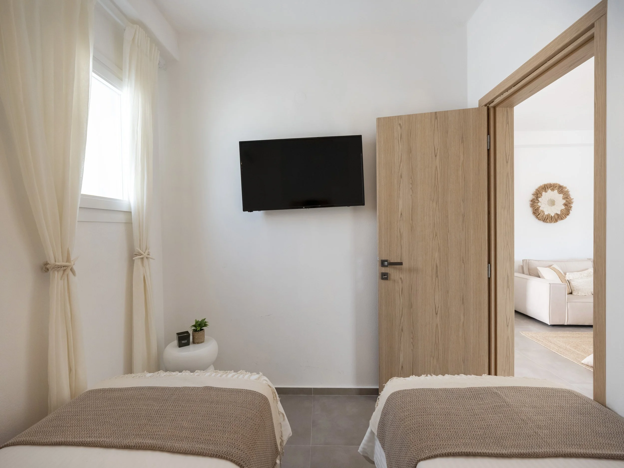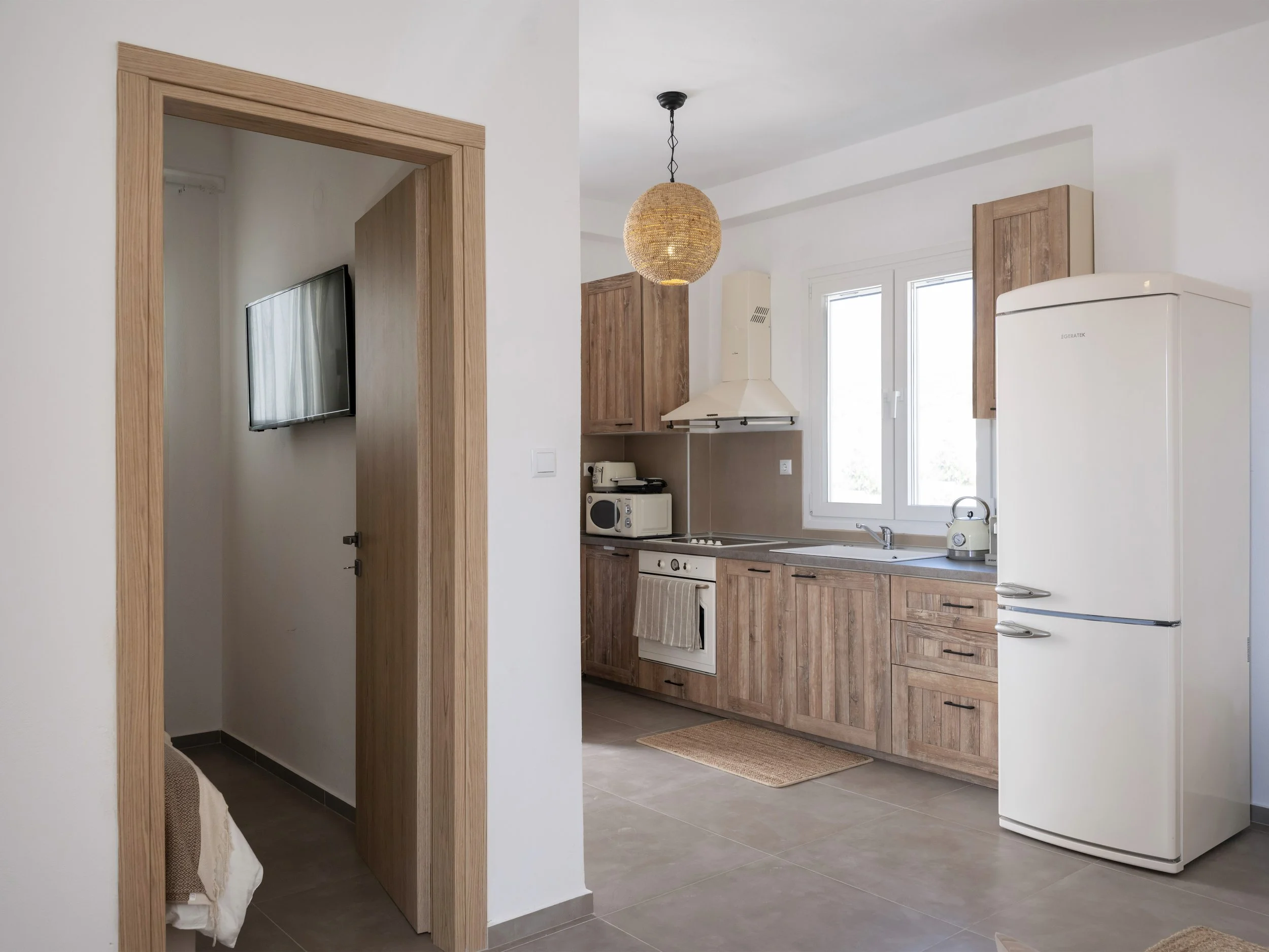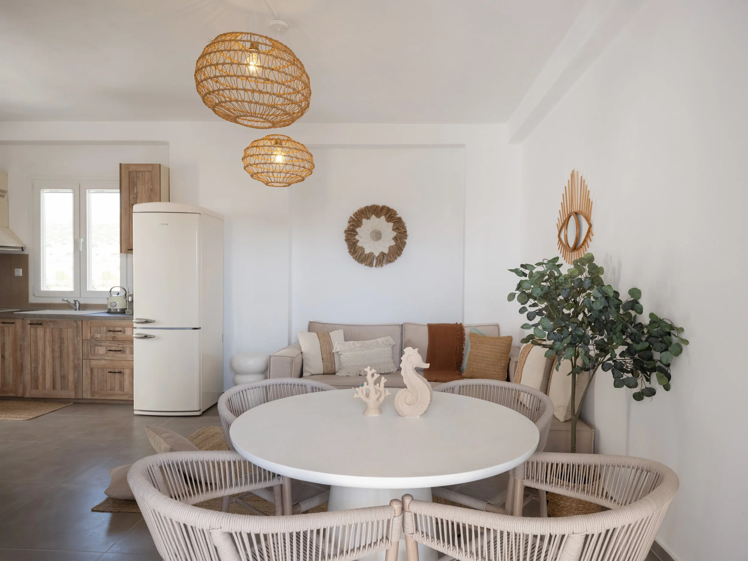 The apartment itself offers two bright and comfortable bedrooms, a fully equipped kitchen with modern appliances and essentials, and an open-plan living and dining area that connects effortlessly to a private terrace—a great spot to enjoy breakfast, sunset drinks, or dinners under the stars.